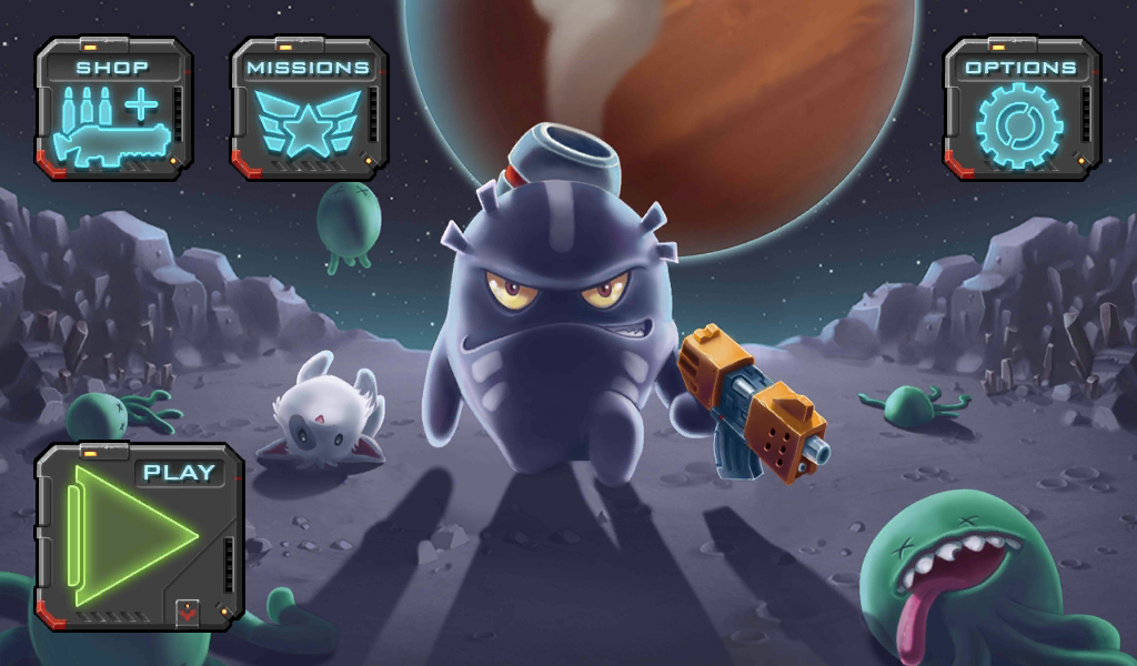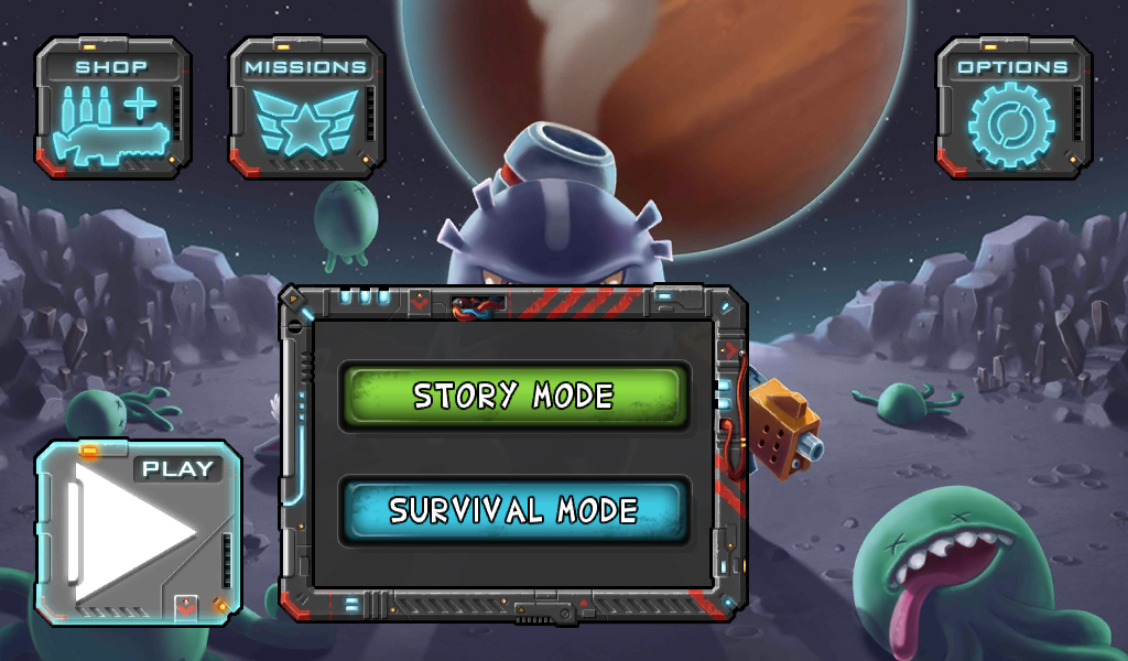 Есть два режима игры. Первый это кампания, в котором Вы будете выполнять разные миссии на 4 планетах. На каждой будут открываться новые виды монстров, со специальными способностями. Всего в игре 80 уровней, то есть по 20 на каждую планету. После загрузки игры Вы можете посмотреть видеоролик, который расскажет Вам о том, как все началось. Но, в общем, суть в том, что на космическом корабле стандартного воображения всех людей (тарелка) прилетели пришельцы и начали похищать разных существ из планеты, на которой спокойно себе спал наш главный герой. Ужасным монстрам было мало того, что они похитили пару коров одноглазых и решили украсть любимого котенка нашего брутального человечка. Он не растерялся и размазал лицо пришельца с помощью СМГ. Тут Вы начинает свой путь истребления этих гадов.