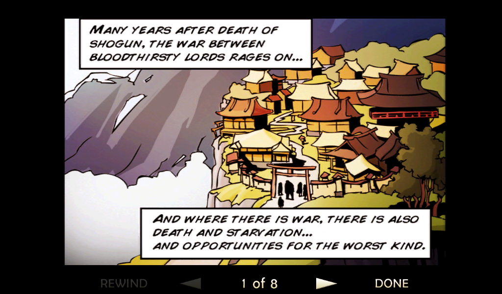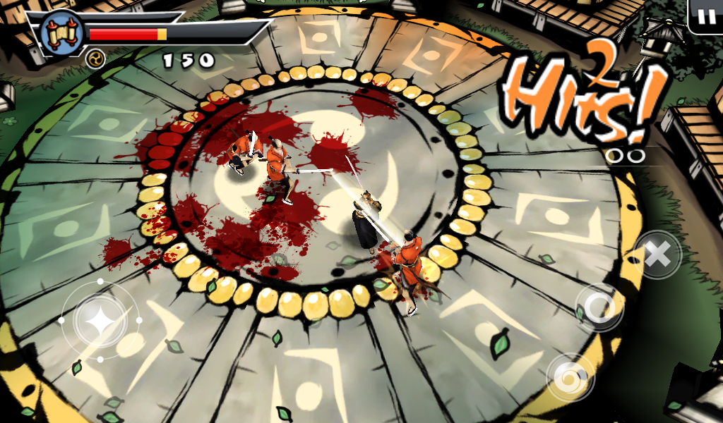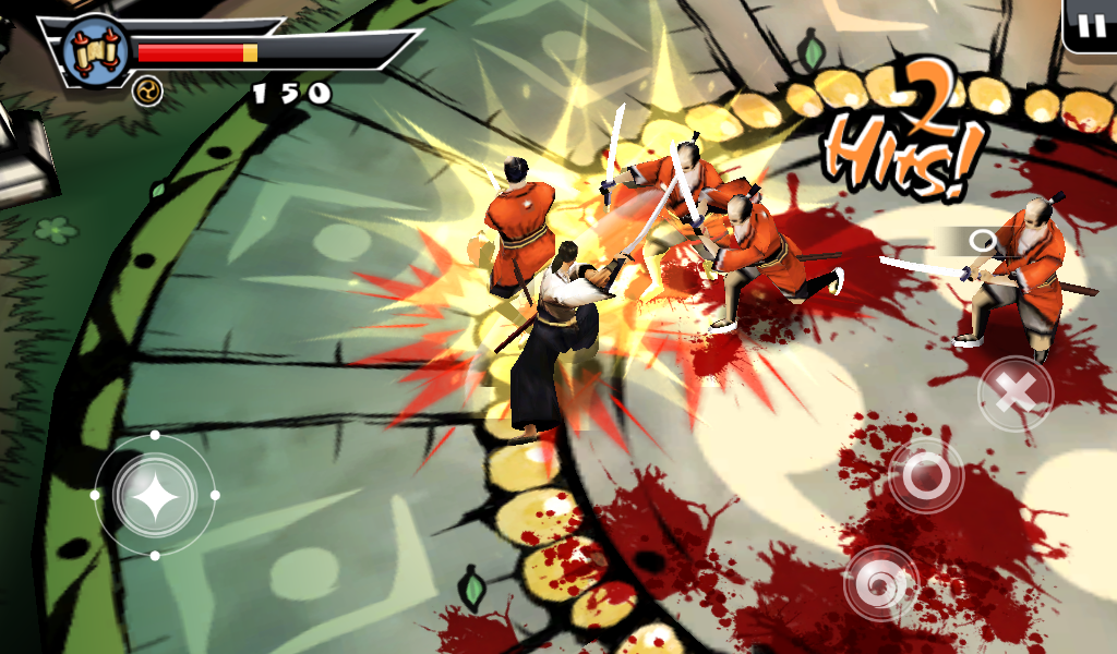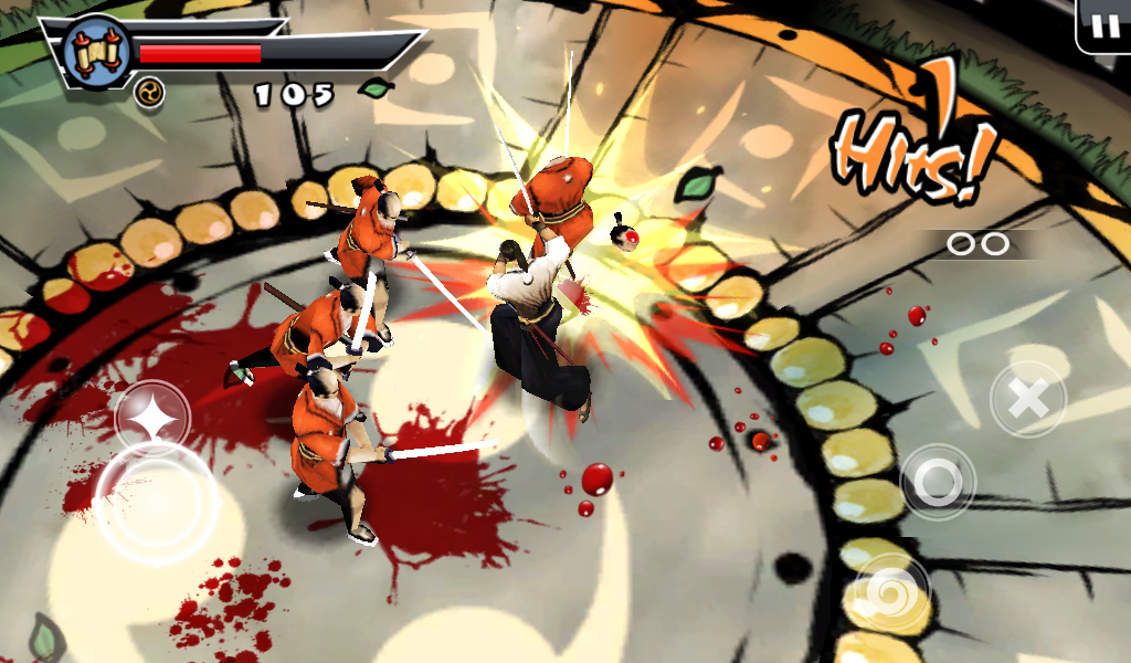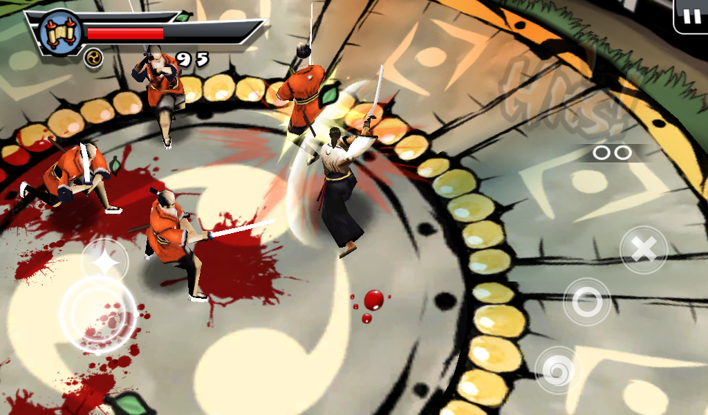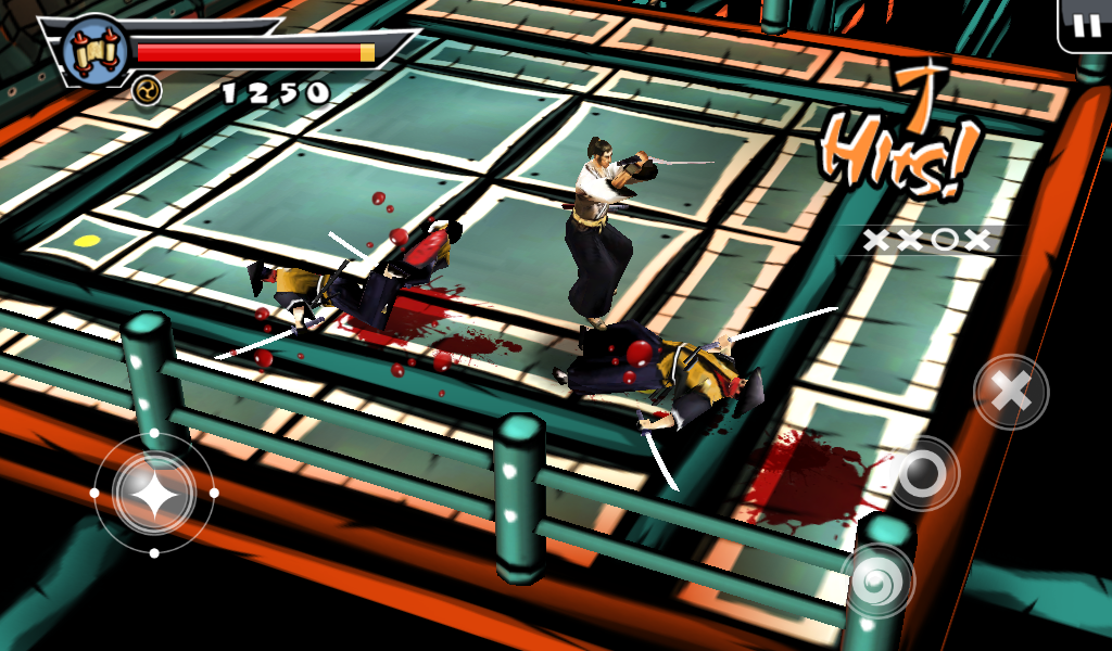 Оставим все позади, давайте разберемся в самом процессе игры и сюжете. Перед началом самой игры читаем небольшой комикс, по которому можно понять, что на тихий поселок мирных японцев напали грабители. Самый сильный и здоровый вор начинает издеваться над бедным стариком, но тут появляется бесстрашный самурай. После недолгого разговора со злодеем меткий японский воин разрезает врага пополам одним ударом меча. Все остальные злодеи бросаются в драку! Итак, начинаем наш путь. Появляемся мы перед ареной, где на нас начинают нападать неумелые бойцы. С каждым разом их становиться все больше и больше, так чтобы игроку было удобно привыкнуть к системе боя. Про меткость и хитрость врагов говорить не стоит, они тупые люди, потому стоит пользоваться этим. Управление самураем будет осуществляться с помощью джойстика движения и трех кнопок действия. Первая «Х» отвечает за ближний удар, «О» за удар дальний а нажимая на третью клавишу самурай начнет делать быстрые кувырки, которые не один раз помогут сохранить жизнь и напасть на врага неожиданно.