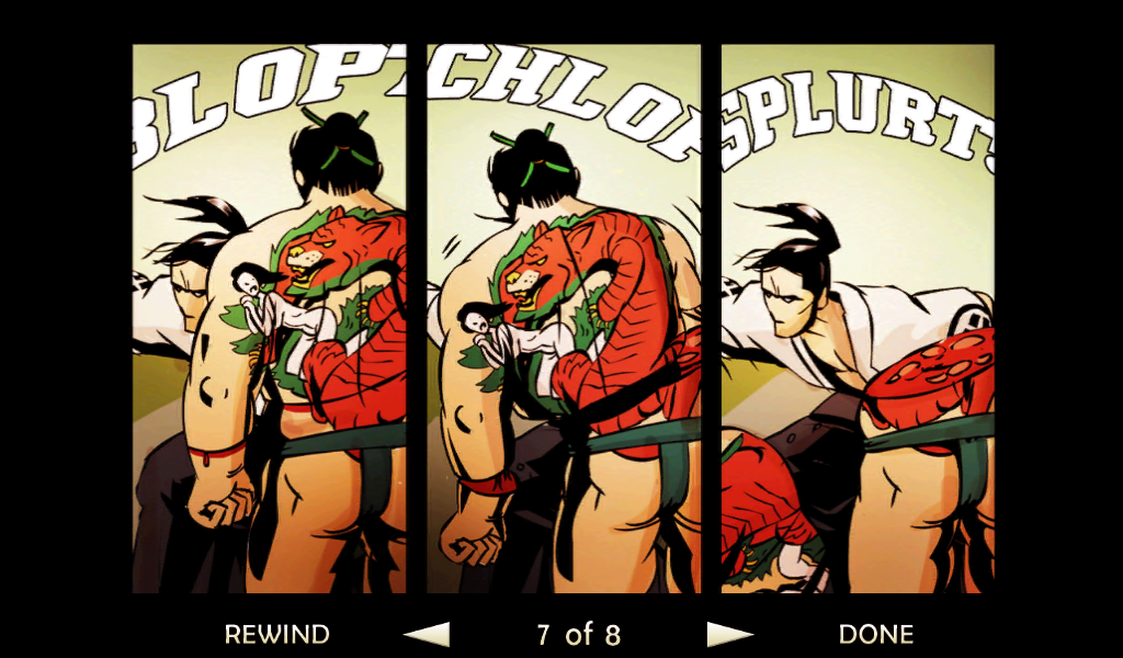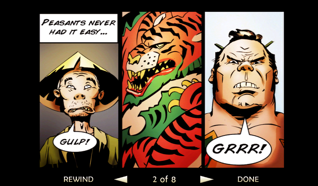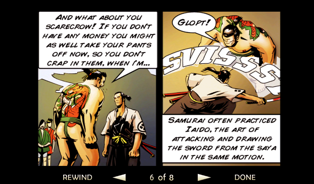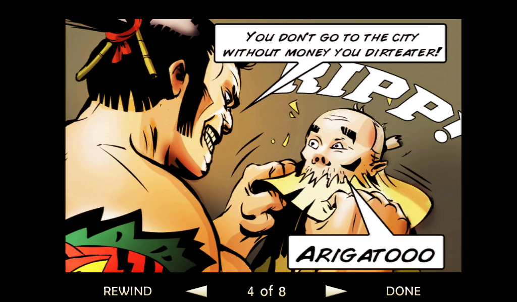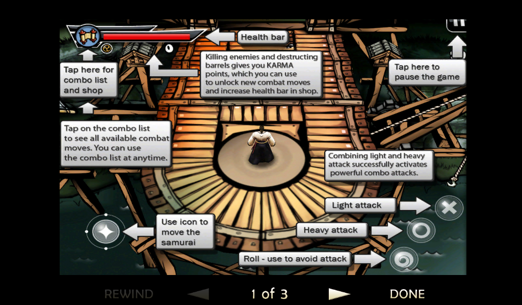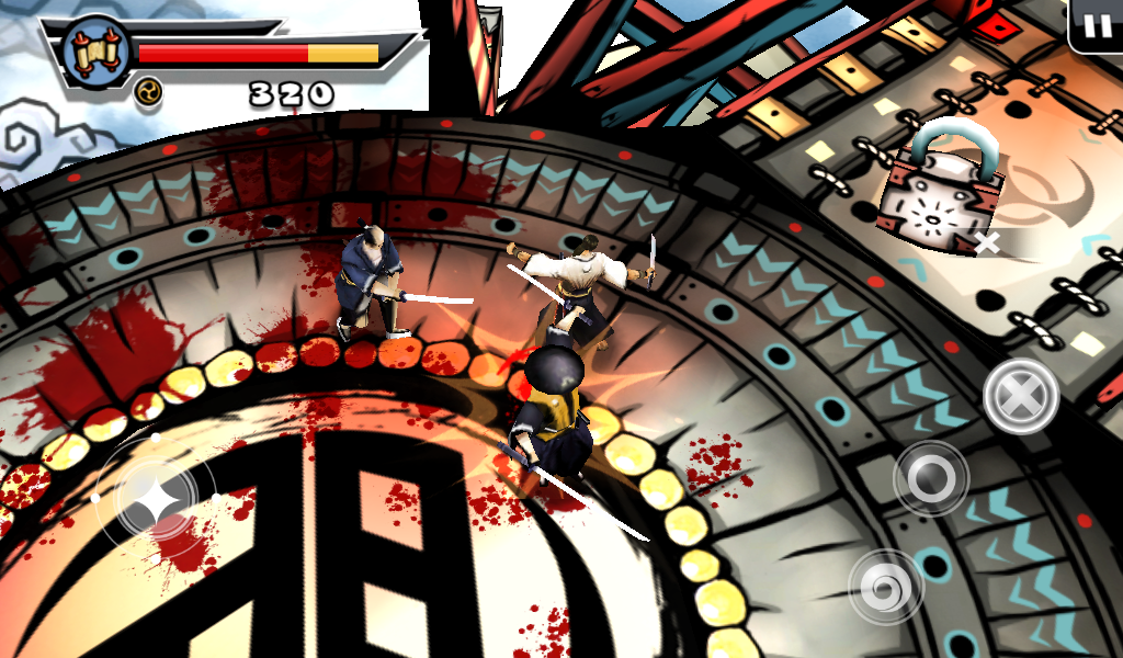 Оставим все позади, давайте разберемся в самом процессе игры и сюжете. Перед началом самой игры читаем небольшой комикс, по которому можно понять, что на тихий поселок мирных японцев напали грабители. Самый сильный и здоровый вор начинает издеваться над бедным стариком, но тут появляется бесстрашный самурай. После недолгого разговора со злодеем меткий японский воин разрезает врага пополам одним ударом меча. Все остальные злодеи бросаются в драку! Итак, начинаем наш путь. Появляемся мы перед ареной, где на нас начинают нападать неумелые бойцы. С каждым разом их становиться все больше и больше, так чтобы игроку было удобно привыкнуть к системе боя. Про меткость и хитрость врагов говорить не стоит, они тупые люди, потому стоит пользоваться этим. Управление самураем будет осуществляться с помощью джойстика движения и трех кнопок действия. Первая «Х» отвечает за ближний удар, «О» за удар дальний а нажимая на третью клавишу самурай начнет делать быстрые кувырки, которые не один раз помогут сохранить жизнь и напасть на врага неожиданно.